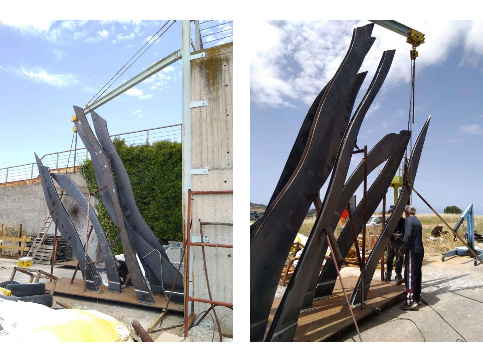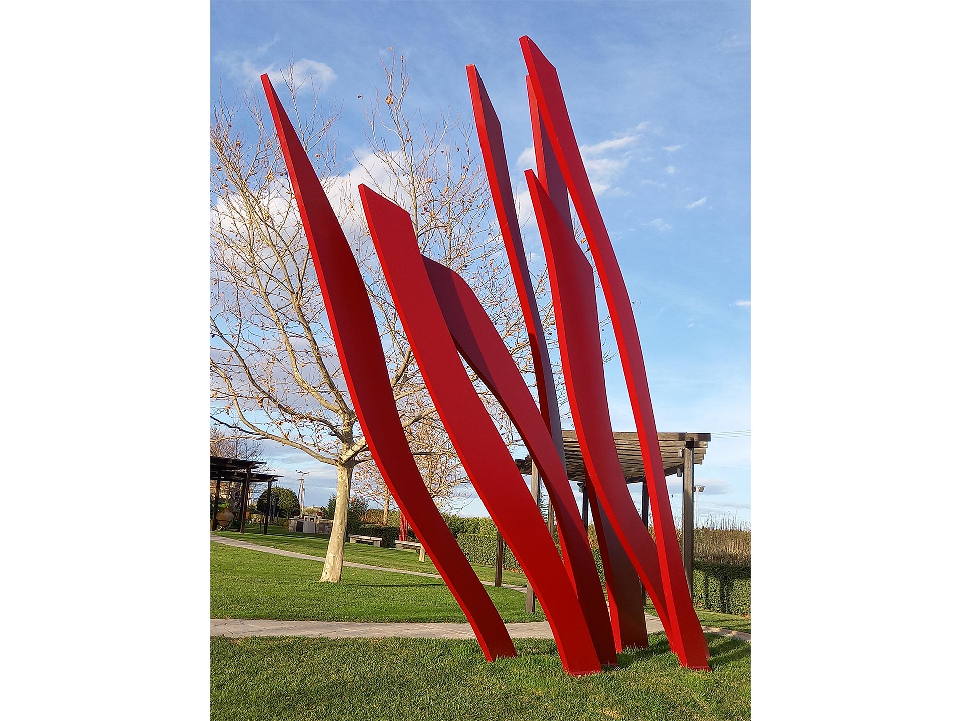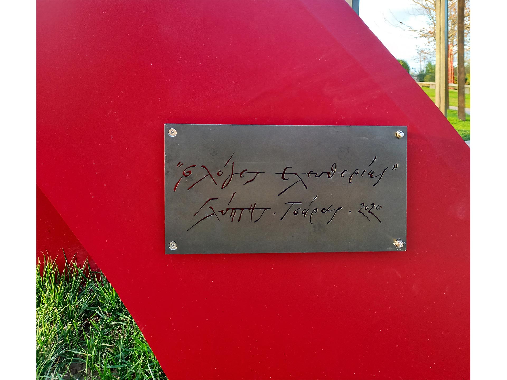 Χρωματισμένος χάλυβας. Διαστάσεις: 550cm x 450cm x 150cm Τοποθεσία: Κτήμα Γεροβασιλείου, Επανομή Έτος: 2020