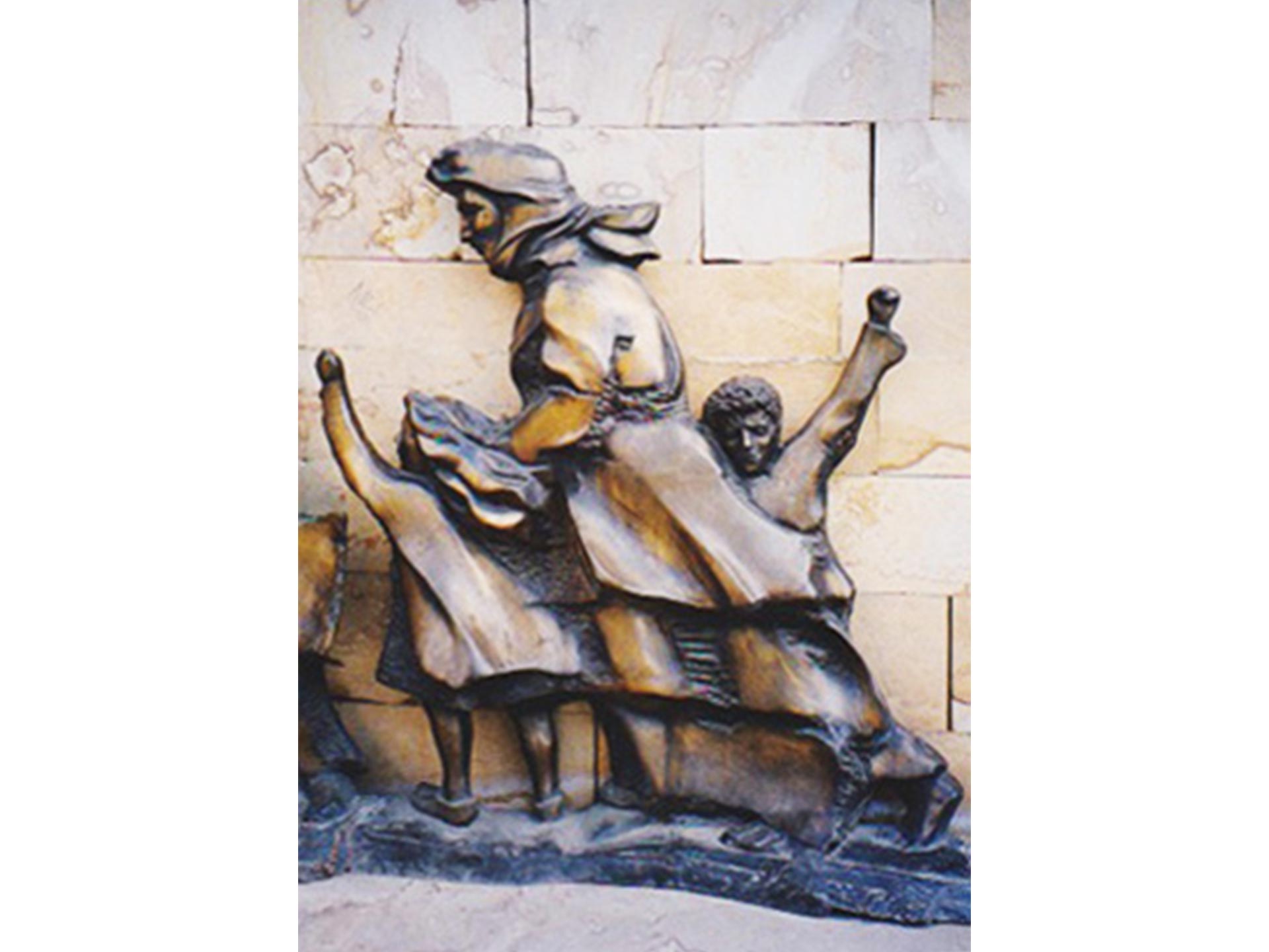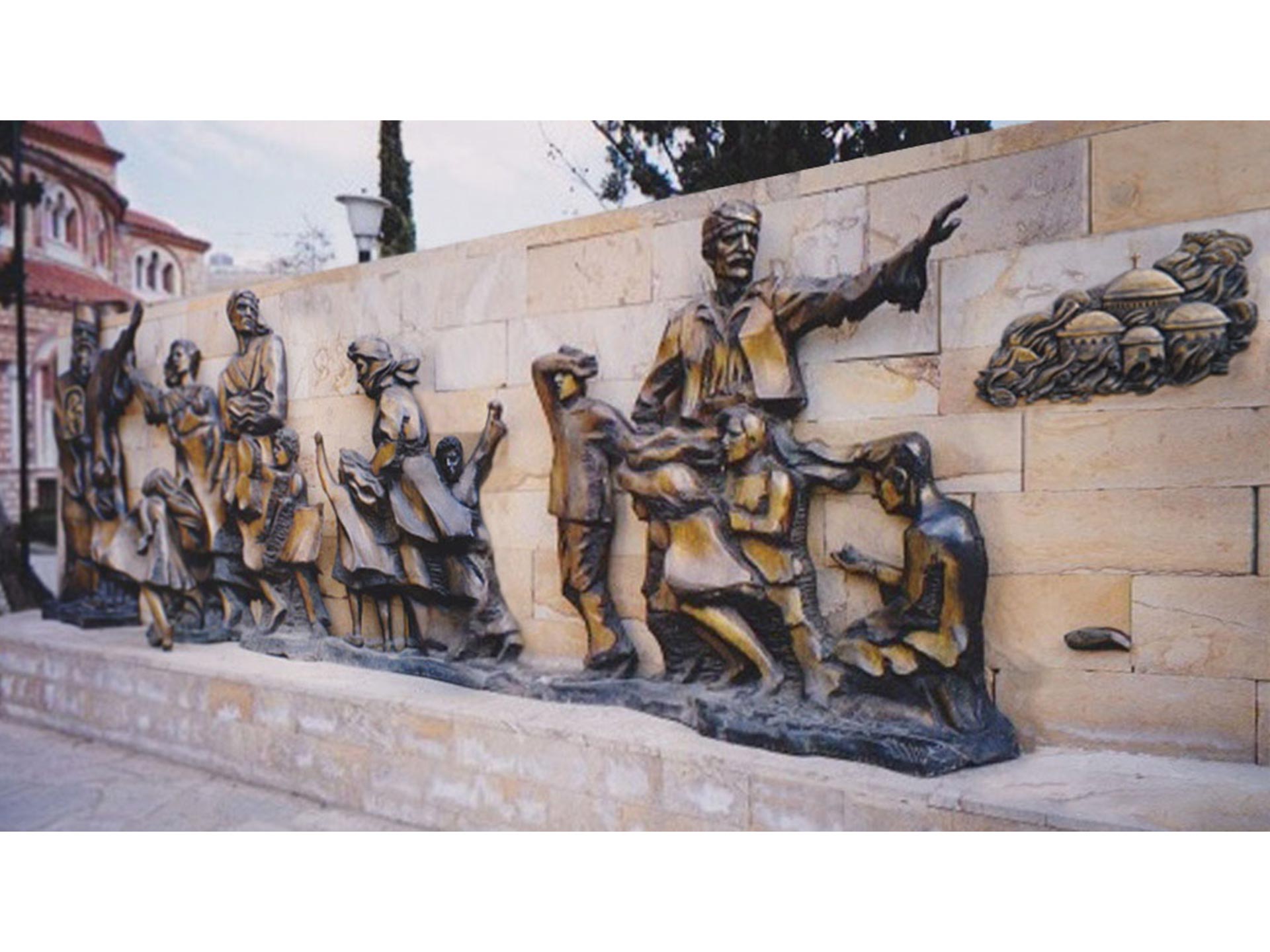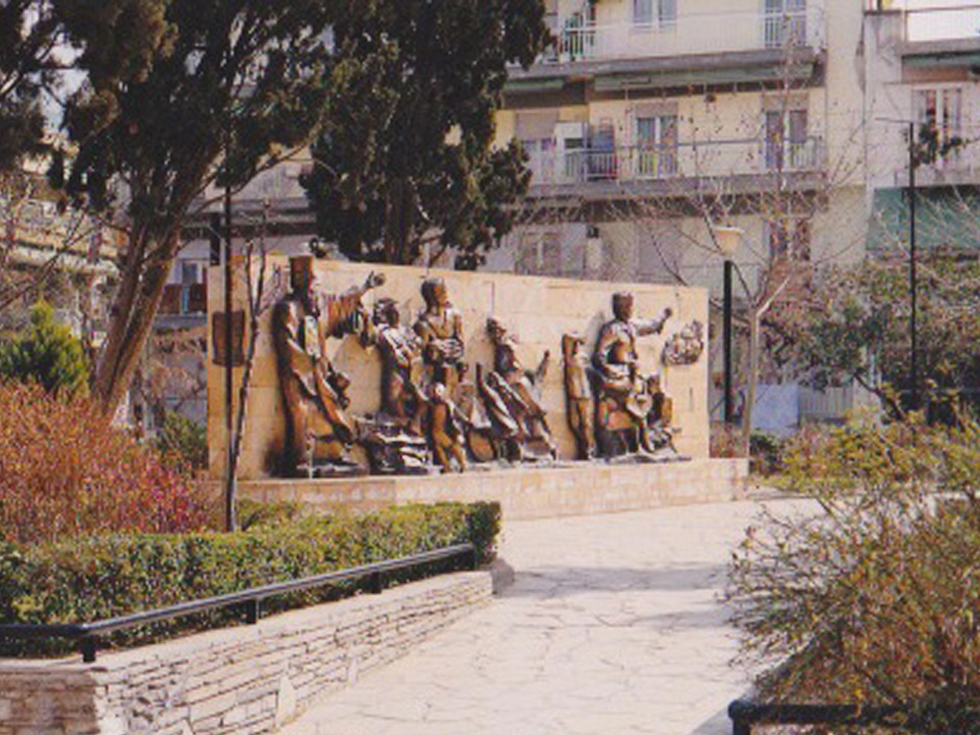 Μπρούντζος, εμφανές μπετόν. Διαστάσεις: 230cm x 900cm x 60cm σε βάθρο από πωρόλιθο Διαστάσεις: 250cm x 1000cm x 80cm Τοποθεσία: Αμπελόκηποι Θεσσαλονίκης Έτος: 1996