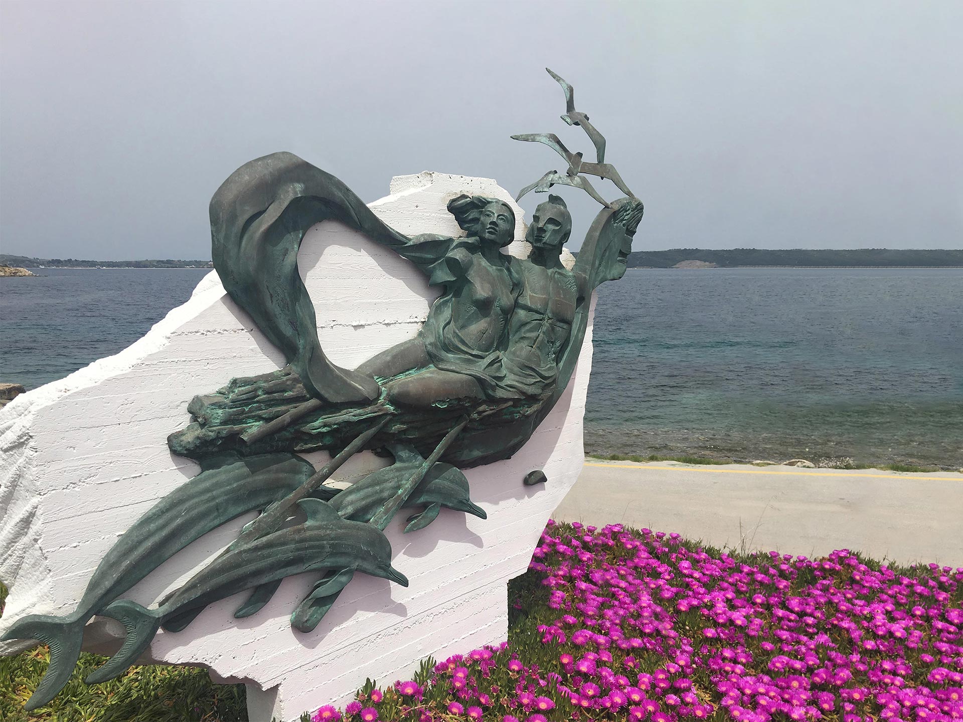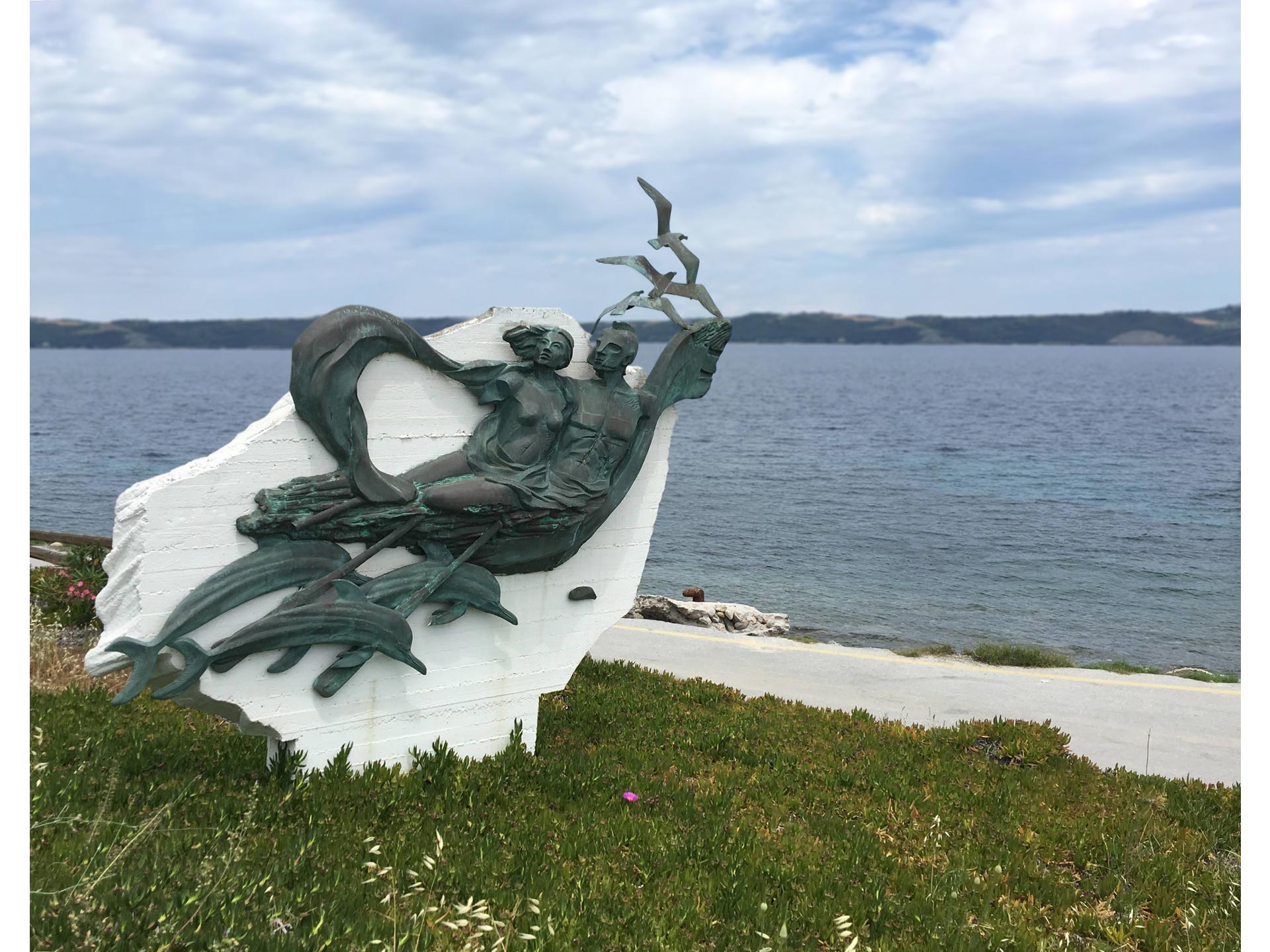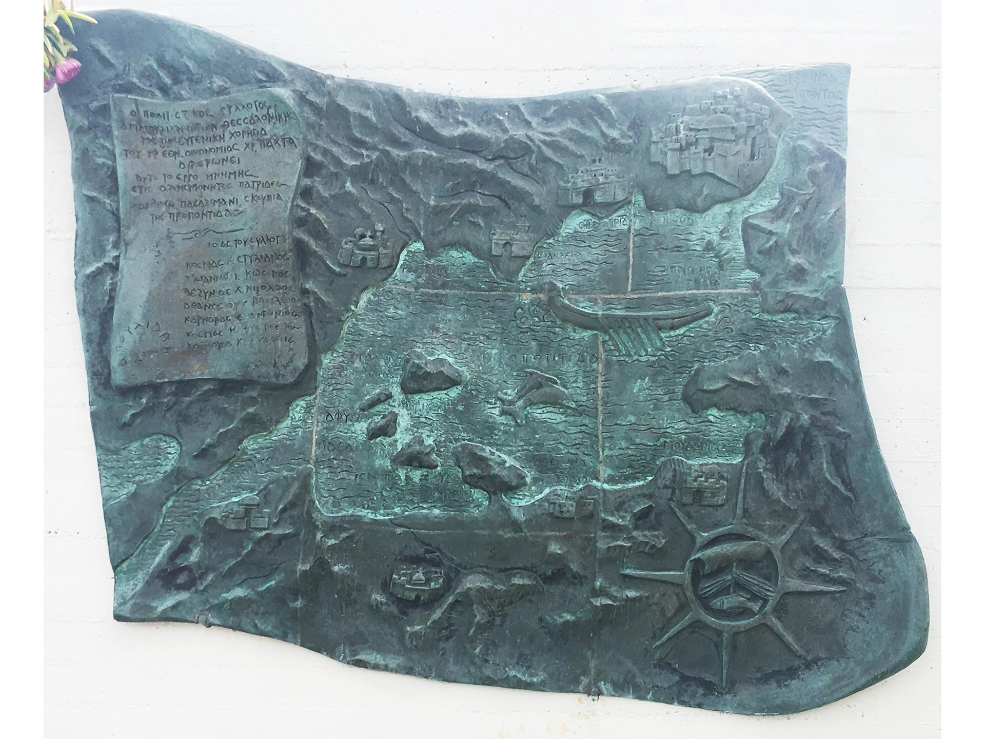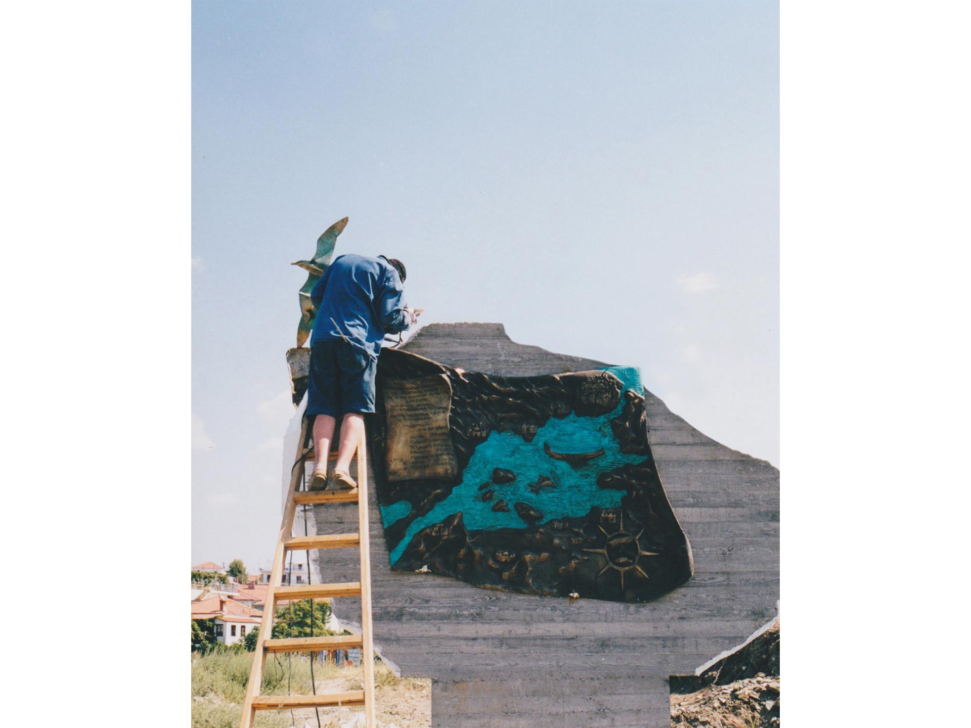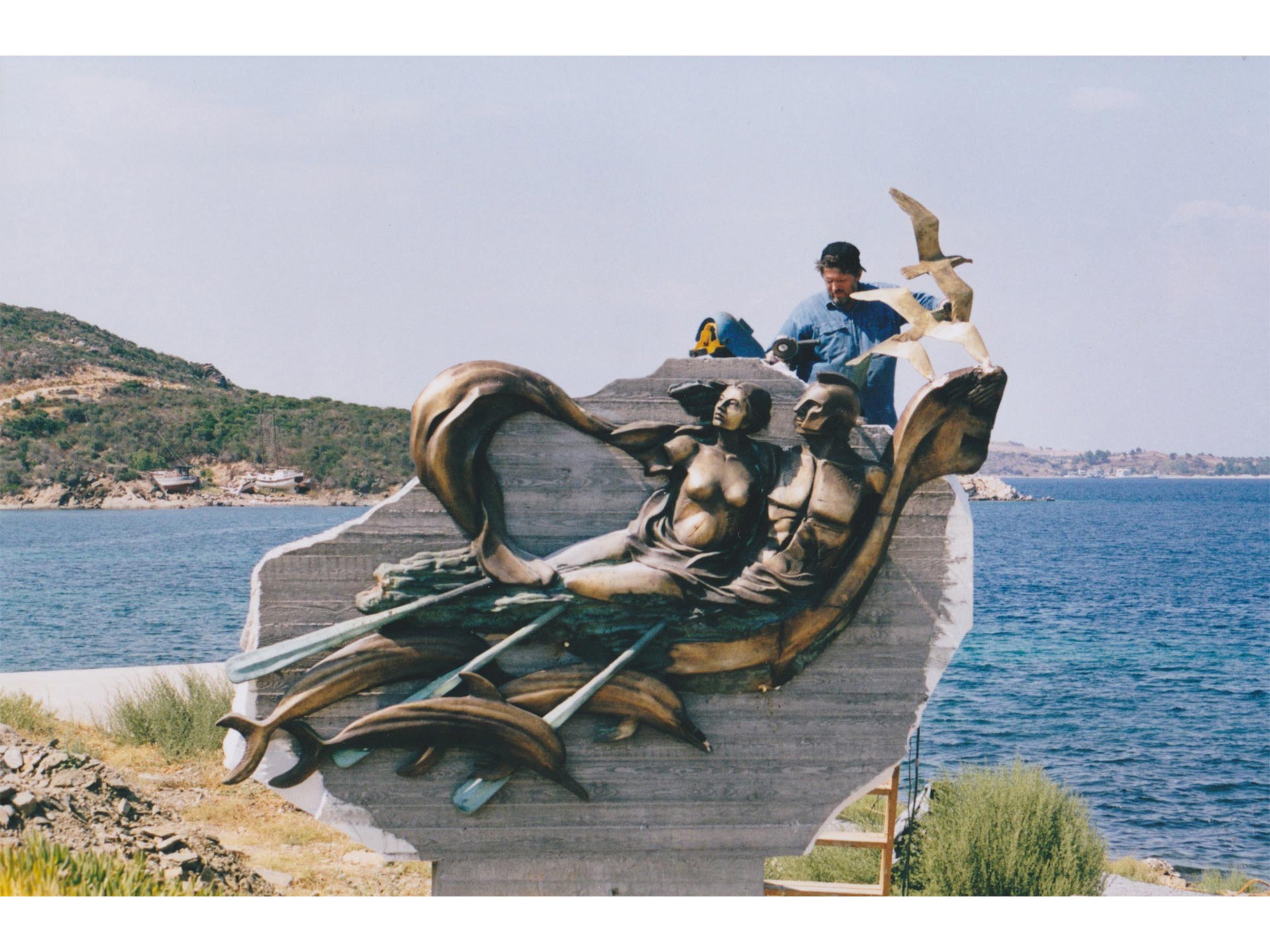 Εμφανές μπετόν, μπρούντζος. Διαστάσεις: 360cm x 510cm x 60cm Τοποθεσία: Αμμουλιανή, Χαλκιδική Έτος: 1997